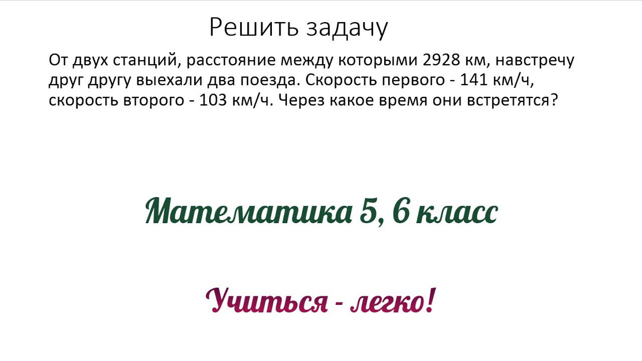 От двух станций расстояние между которыми 2928 км навстречу друг другу выехали два поезда. Скорость первого - 141 кмч скорость второго - 103 кмч. Через какое время они встретятся? автор видео Учиться - ...