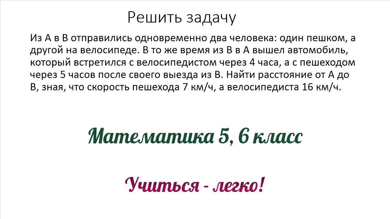 Из А в В отправились одновременно два человека: один пешком а другой на велосипеде. В то же время из В в А вышел автомобиль который встретился с велосипедистом через 4 часа а с пешеходом через 5 часов п...