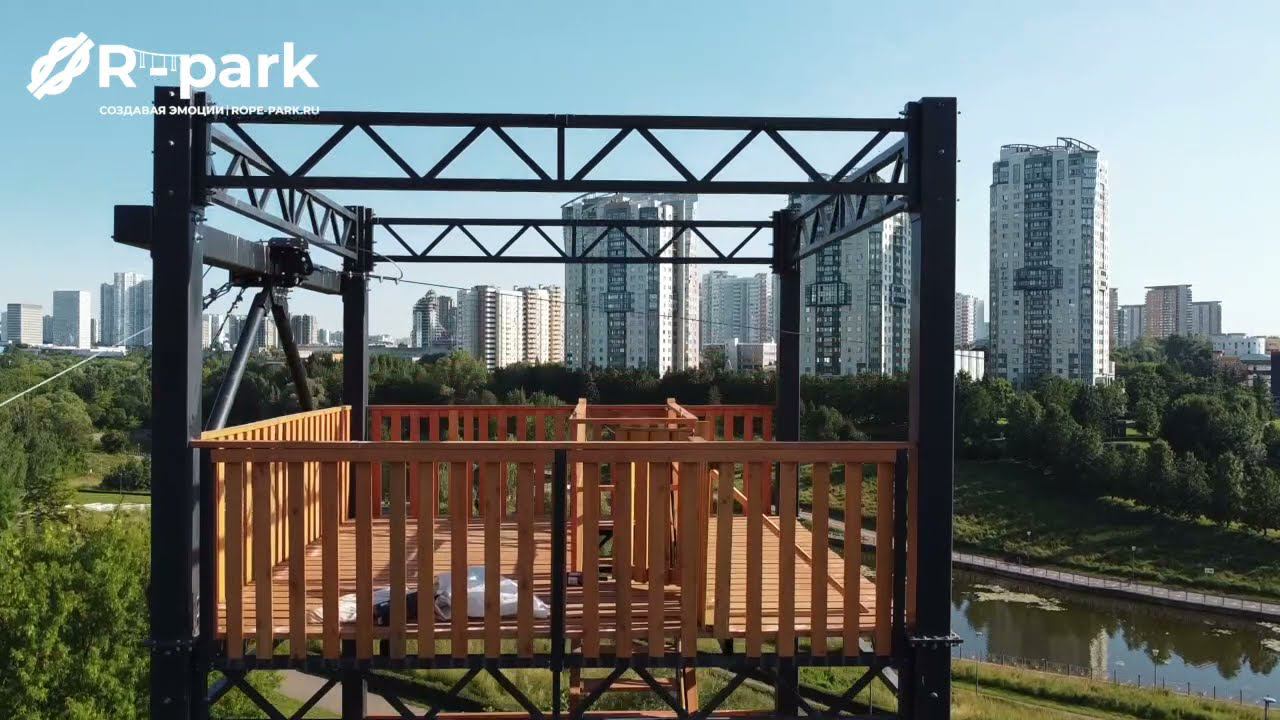 Зиплайн в парке Олимпийская деревне длиной 400м. Стартовая башня из металлокаркаса высотой 15м. Финишная башня из металлокаркаса высотой 6м. Для безопасного торможения используется тормозная система Zip...