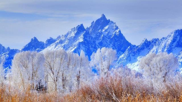 Электронное звучание музыки на фоне великолепного горного пейзажа. Красивый вид высоких гор в сочетании безлиственных замороженных деревьев и небесным синем небом. Слушать электронную музыку на фоне кра...